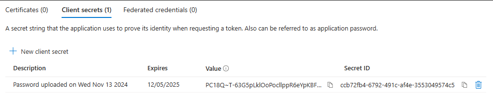 - Generate a Client secret in "Certificates & Secrets". Record the Secret Value and Client ID, you will need both later.