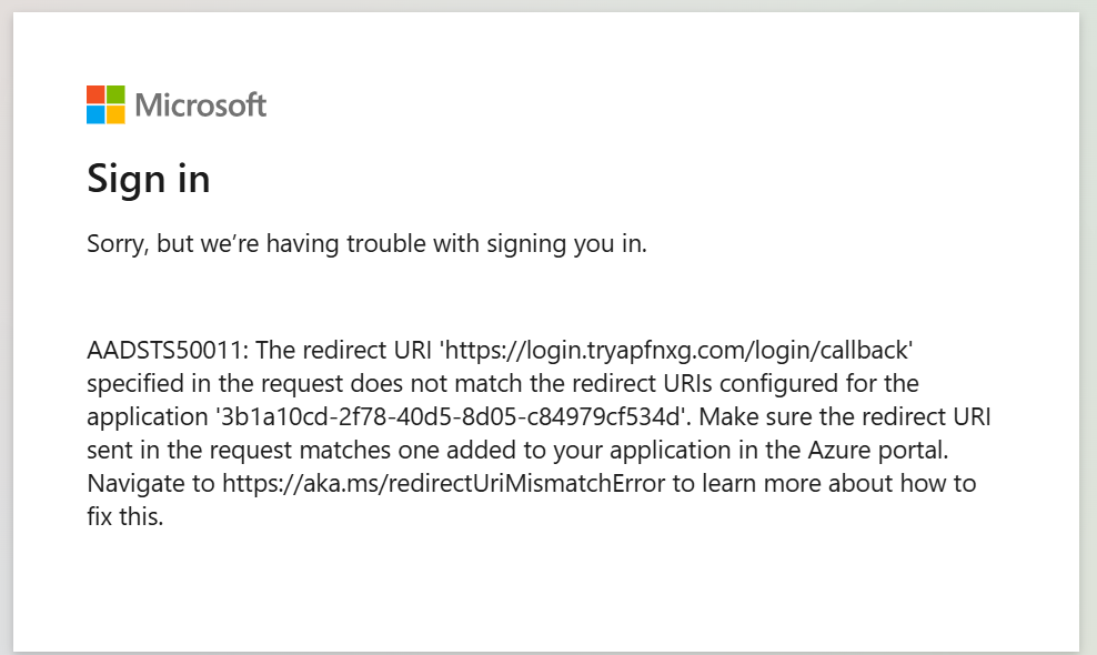 AADSTS50011: The redirection URI specified in the request does not match the redirect URIs configured for the application.