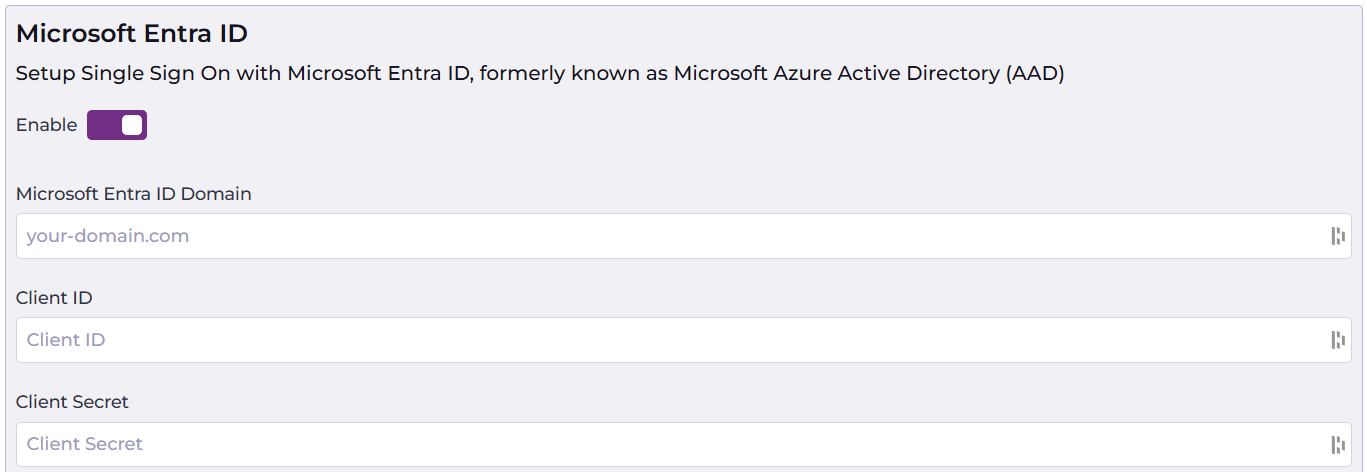- Enable Microsoft Entra ID and enter your Microsoft Entra ID Domain