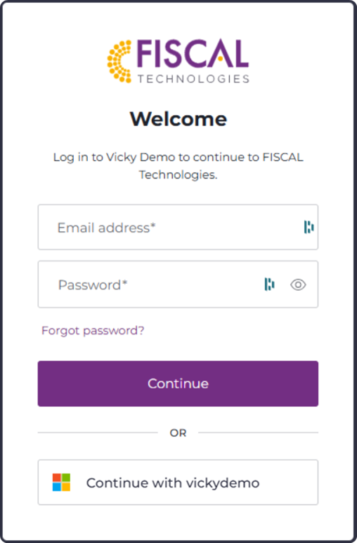 Once the Entra settings have been saved within FISCAL, on the login page, the option to log in using your identity provider will show as a button "Continue with mycustomer" (where mycustomer is the name of your FISCAL site).